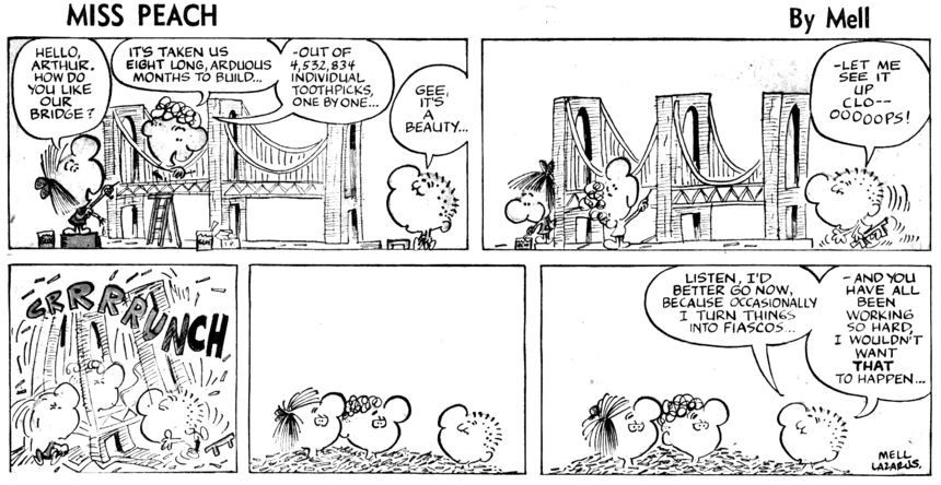 Which makes this a good time to slip in Peanuts (1950) and Miss Peach (1957). I particularly liked Miss Peach when it came along because the gags were kid-friendly, while Peanuts was really written for adults, at least until Snoopy began to take over the strip.