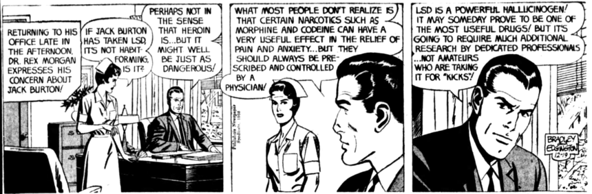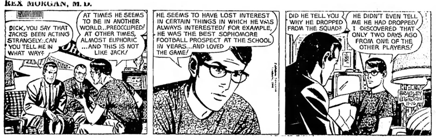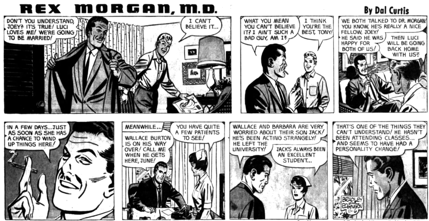 Rex Morgan was still an educational strip in those days, and this Sunday started a return to a topic he’d famously covered a few years earlier, but this time around with seemingly less Joe Friday-style hysteria, as we see in a couple of the dailies that extended the new arc.