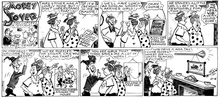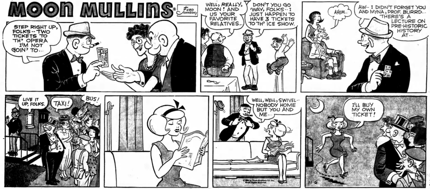 Which makes this a good time to slot in a couple of other oldies, Smokey Stover (1935) and Moon Mullins (1923). I note that Miss Swivel seems a bit ahead of her time. In those days, of course, a pretty girl who didn’t want to be chased around the desk was suspected of being sensible.