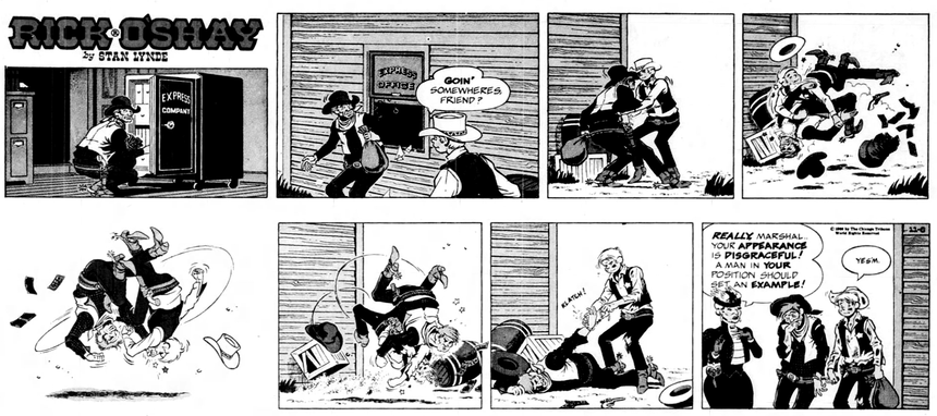 Finally, an appreciation of Rick O’Shay, a compact little Western that told short stories with graceful, attractive art that I always enjoyed, whether it starred Marshal O’Shay himself or the slightly sinister but philosophical gunslinger, Hipshot Percussion.