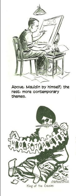 JUST ABOUT EVERY PAGE in the 226 7×10-inch page Drawing Fire: The Editorial Cartoons of Bill Mauldin (2020 Pritzker Military Museum hardcover, $35) has a Mauldin cartoon on it. Just one. Which means his cartoons are given greater display herein than they ever got in the newspapers that initially published the cartoons. Mauldin drew political cartoons for about 40 years; and he drew cartoons about ordinary foot soldiers (“dogfaces”) in World War II as a 5-year prologue. That was the first war he cartooned about; he would cartoon about four more, ending with the first Gulf War.
