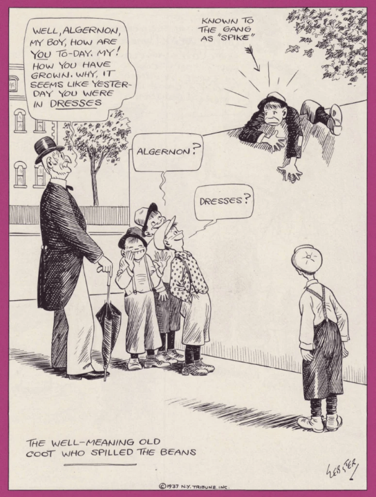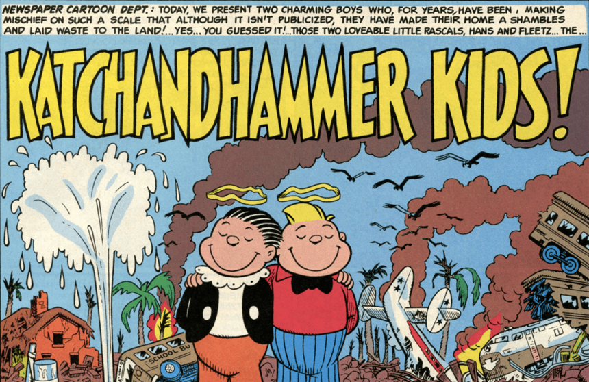 Elder, the maddest of Harvey Kurtzman’s original crew of MAD-men, delivers a parody of the classic Katzenjammer Kids comic strip – so note-perfect in the drawing style, that it might be casually mistaken for Rudolph Dirks’ original 19th-century conception. Except that Dirks never had meta-humorist Kurtzman around to handle the writing.