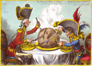 Born in 1756, Gillray set the template for the modern political cartoon. He combined the old tradition of the political print with the more modern art of personal caricature, his savage humour and supreme draughtsmanship making him the unrivalled visual satirist of the day. In The Plumb-Pudding in Danger he created arguably the greatest, and certainly the most pastiched, example of the form. For many contemporary political cartoonists he is a direct influence, but all cartoonists are indebted to him.