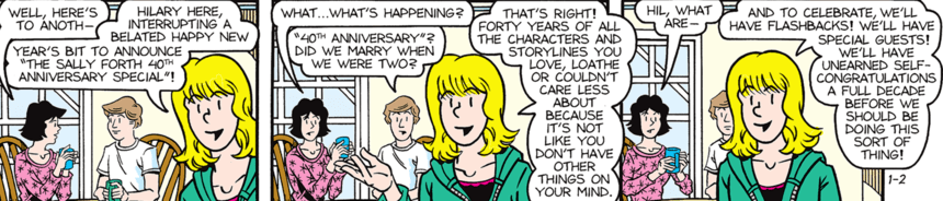Skip to commentsThe Sally Forth comic strip is 40. And Ces and Jim will take us back to the beginning beginning tomorrow (January 3). They give us a bit of forewarning in today’s strip.