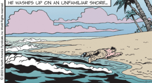 He has washed up “on the shore of this uncharted desert isle.”