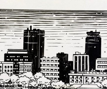 Pen and ink establishing shot for today’s Sally Forth (2/7/2022). Realized after the fact that the trees shouldn’t have leaves on them in February. Fixed it digitally but unsure who would’ve noticed with how small the details are.