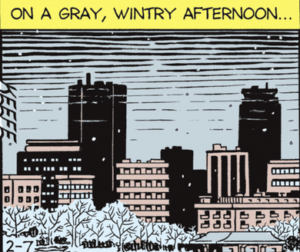 So after coming up with the pun Wayno had to draw the background for the vertical panel, redraw it for the horizontal panel, and then come up with that spotlight image for the black and white model.