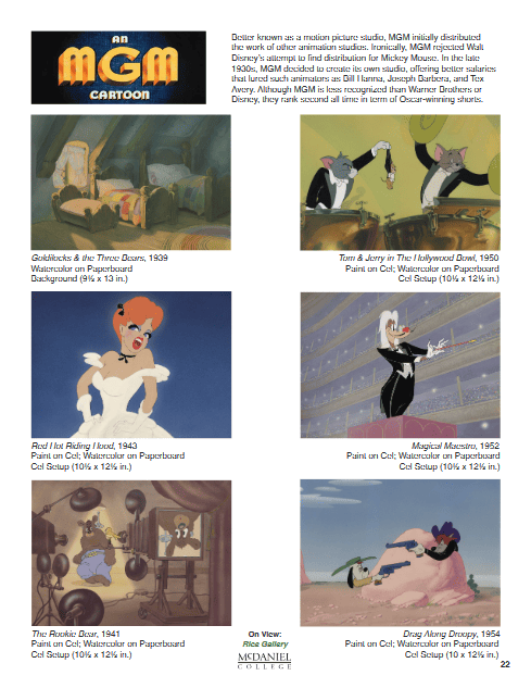 Originally scheduled for January 2021, Icons of American Animation is a dual-venue exhibition presented concurrently at McDaniel College and the Carroll County Arts Council, which are located less than one-half mile from each other in Westminster, MD. Spanning the 20th century, with over 150 pieces of original animation art, the exhibit promises to be one of the largest of its kind, with an emphasis on notable characters, films, animators, and production studios associated with both film and television.