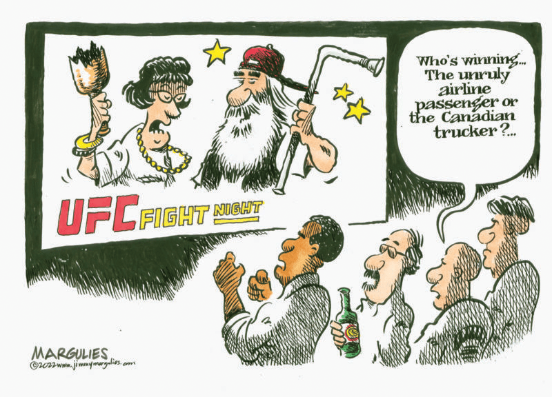 Jimmy Margulies (KFS) leads off with a comparison of nitwits. As noted yesterday, not knowing squat about Canada didn’t stop Yanks from not only commenting on the convoy but actively supporting it, and now we’ve got Republican Senators coming to the defense of people who violently disrupt airline flights.