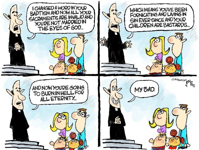 As another of my fellow recovering Catholics, Nathan Monk, pointed out, the Church teaches that anybody can baptize a dying person and have it count if both parties are sincere, to which I would add that it’s been 1500 years since the Church did away with the Donatist heresy, which wrongly held that sacraments performed by a sinful priest were invalid.