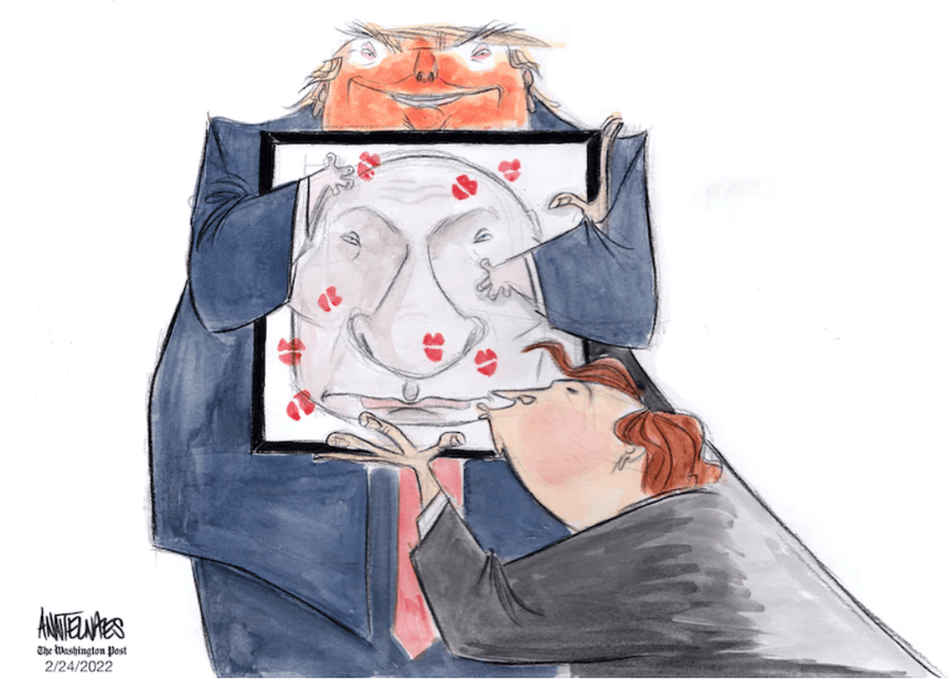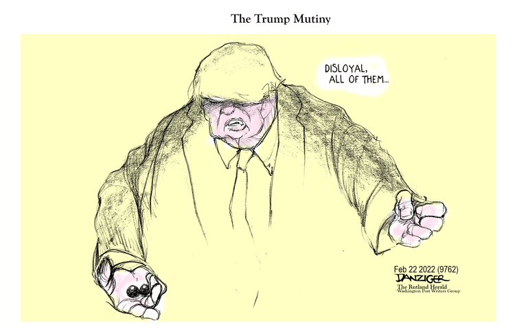 I’m hearing people question the stability of Putin’s other American Boyfriend, saying that he’s not simply obsessed with the Big Lie but seems to be falling apart. Jeff Danziger (WPWG) compares him to Captain Queeg from the Caine Mutiny, erratically defending his paranoid fantasies.