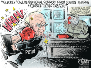 … I say to myself, “That’s not funny or insightful, just stupid and mean.” Most of the time, it’s for one by Andy Marlette. I hope your editorial staff will ask whether it is funny or insightful before publishing any more of his work. The latest one with Zelensky punching Putin could have been pretty good if he hadn’t maligned Tucker Carlson. I often disagree with Tucker Carlson, but he is one of very few political commentators who will debate with anyone from any party or political view and challenge them. Also, his in-depth interviews always give me new political insights.