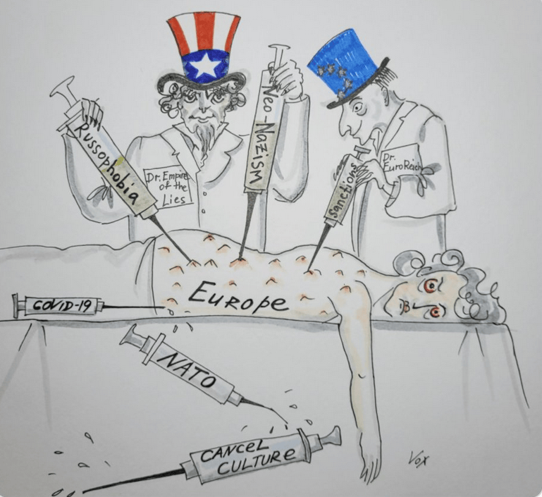 The Russian Embassy in Paris on Thursday had posted a picture depicting a body lying on a table called “Europe” with characters representing the United States and European Union jabbing needles into it.