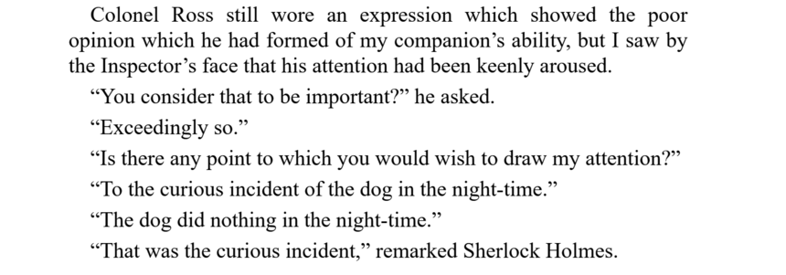 In “Silver Blaze,” the fact that the dog does not bark tells Holmes that the horse thief was not a stranger, but someone the dog knew and trusted.