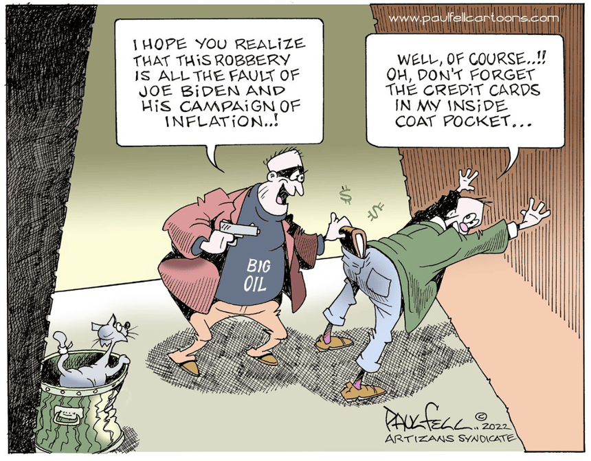 Mind you, Paul Fell isn’t the only dog barking at industry — oil and others — for choosing to maintain profits despite the impact on customers and, as his robbery victim volunteers his credit cards, it seems likely consumer debt will be rising as we all run as fast as we can just to stay in one place.