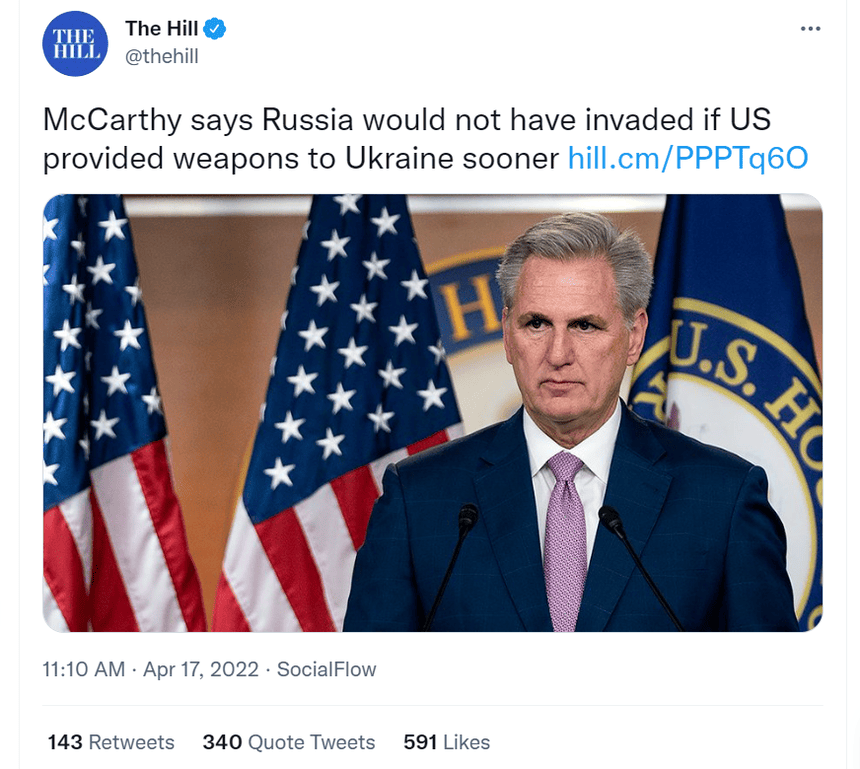 After all, House Minority Leader Kevin McCarthy has gone on record as saying the war in Ukraine might have been prevented had we only armed Zelensky’s forces before the invasion.