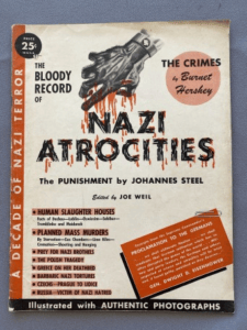 In early January 1945, just before the liberation of Auschwitz, a small group of journalists and artists, many of them European immigrants, published a roughly 50-page pamphlet titled The Bloody Record of Nazi Atrocities. Printed by Arco Publishing Company, a small imprint based in New York, it combined previously circulated photographs, drawings and text with newly commissioned works documenting the mass killings of European Jews, Roma and Sinti. Though the victims’ ethnicity was the main reason the Third Reich targeted them, the pamphlet largely omitted this fact in favor of presenting a broader narrative of Nazi inhumanity that generated support for the Allied war effort.