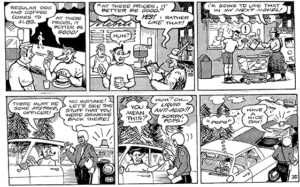 In the early ’90s, I encouraged Justin to submit a daily strip idea to King Features. I figured if they ran with Zippy, there might be a shot at another Underground-derived strip, especially since King’s comics editor then was Jay Kennedy, author of the original Underground Comix Price Guide and a big fan of Justin’s. These Wolf Boy (above) strips were one attempt–there were a few others–but it was not to be. I guess King figured one weirdo (me) was enough for their befuddled salesmen.