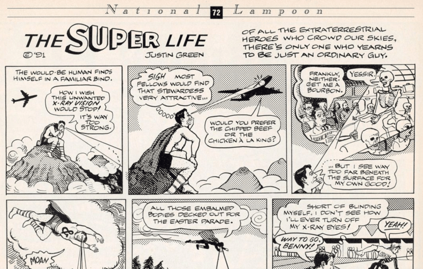 I phoned Justin at his home in Sacramento and he told me he had been enjoying my work and was flattered to be asked to contribute to the Lampoon. When I mentioned that the page rate was $600, he took a long pause, and without a trace of sarcasm responded: “Well, I guess my ship has come in.” I told him he could create anything he’d like for the “Funnies” section, I didn’t want to hinder him or steer him in any direction (or any of the other artists), aside from the single caveat that the comic strip be funny, or what he perceived as funny…