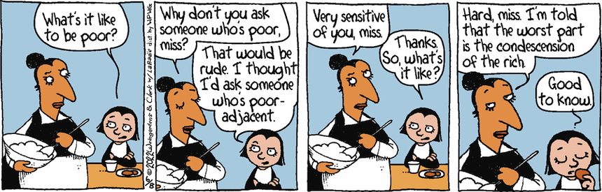 These strips are already a juxtaposition, because, while Cynthia is only vaguely aware of her privileged life, so, too, Agnes and Trout are only vaguely aware of how low on the social register they dwell. In both cases, the cartoonists make that a recurring central element and a stark contrast to the Ozzie and Harriet middleclass world that is the default for most strips.