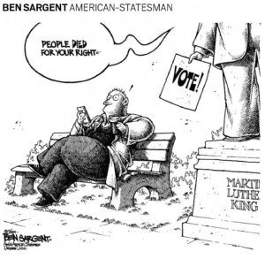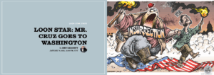 Ben Sargent started as a Texas reporter. In 1974 he became the staff editorial cartoonist for The Austin American-Statesman, a job that lasted until 2009. After that he freelanced cartoons, once a week more or less, for that newspaper until 2014. These days he contributes a “Loon Star State” cartoon to the Texas Observer magazine, something he has done for 13 years.