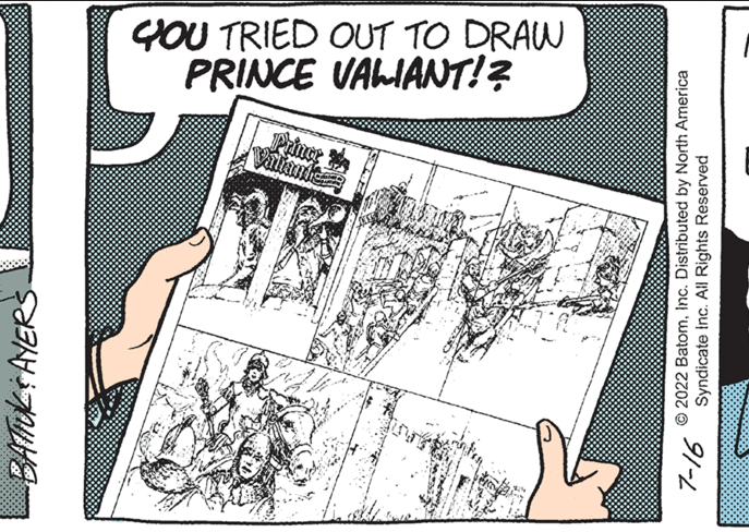 It seems Gray Morrow and Wally Wood weren’t the only Silver Age comic book artists to try grab the brass ring of succeeding Hal Foster as Prince Valiant comic strip artist. Phil Holt also gave it a shot, as seen in today’s Funky Winkerbean.
