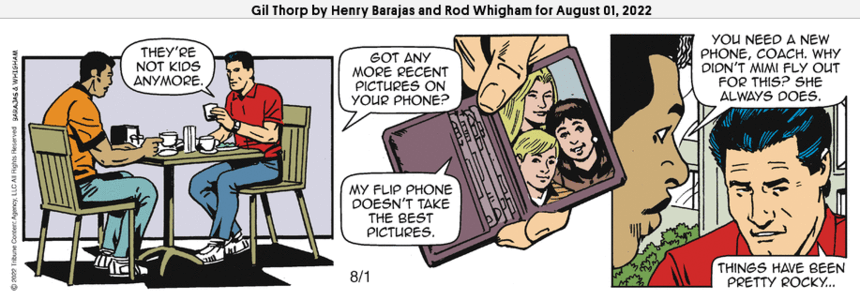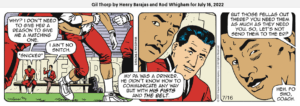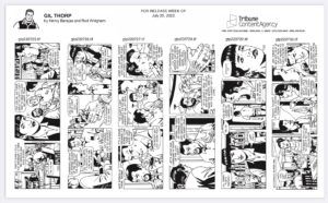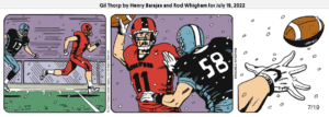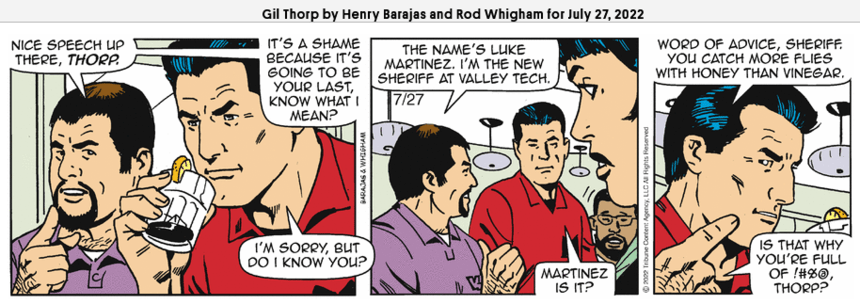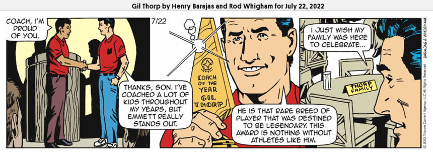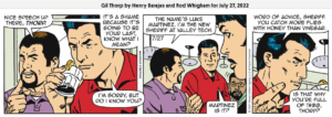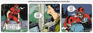 I took over after Neal Rubin on Monday, July 11th. Please click here if you want to start from the beginning of this beautiful journey with me. I hope you subscribe to your local newspaper and read Gil that way. But the next best way is to read it on GoComics where there is a fun (sometimes harsh) community of Gil Thorp fans with their way of communicating. It’s unreal and confusing. But I love them.