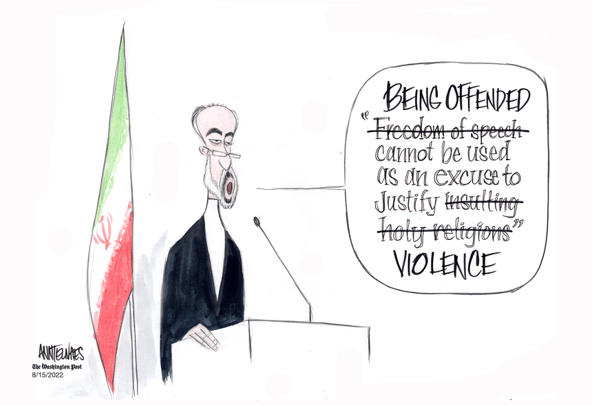 Ann Telnaes would like to correct the statement from the Iranian government, but they have no interest in freedom of expression, nor are they prepared to turn away from the extremism of the revolution, which continues in a nation torn between westernizing modernists and conservative medievalists.