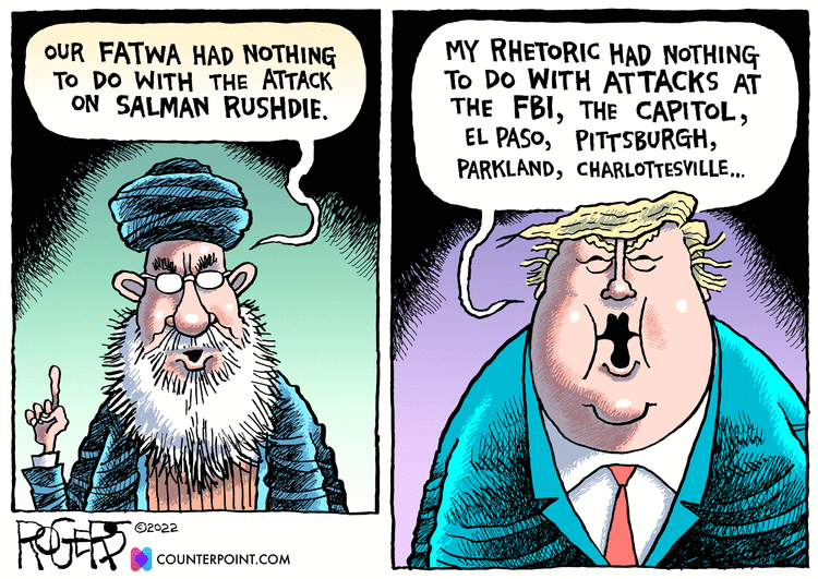 Which brings us to the attempted murder of Salman Rushdie and this Graeme Keyes commentary, because it’s not about logic but about faith, and not the good kind of faith but the kind that means a man with a fanatical following could shoot someone on Fifth Avenue and not lose a single devotee.
