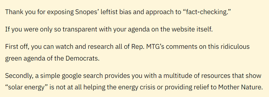 No, the war against reason even extends to Marjorie Taylor Greene telling a crowd that people with solar panels have no electricity after sundown, and getting wild applause for her technical insight.