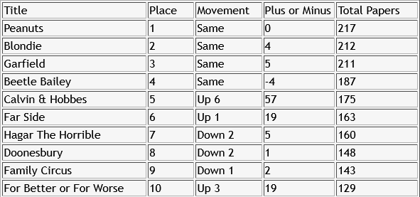 Sally Forth, Arlo and Janis and Funky Winkerbean entered the Top 30. The three strips that fell out of the Top 30 were Bloom County, Winthrop, and Gasoline Alley.