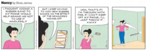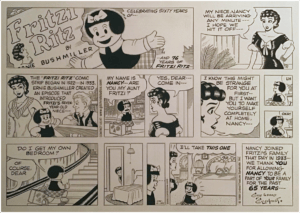 Now, stripped of her own strip, Fritzi continued as a supporting character in Nancy. As time went on Fritzi became a less frequent presence depending on the artist and ghosts doing the Nancy strip. In the mid-1980s Jerry Scott took over and gradually changed the art to a bigfoot style where Fritzi and adults didn’t fit. Once fully Jerry-mandered Fritzi, when she made the strip at all, became an off-panel voice.