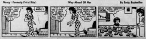 As with Snuffy Smith and Barney Google, Steve Roper and Chief Wahoo, Winthrop and Morty Meekle, and many others the new character became the star attraction. Within a few years Fritzi was taking a back seat to Nancy and by the end of the decade the daily strip was retitled Nancy (gradually and at different times in different newspapers).
