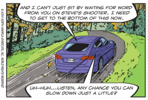 Nostalgic for those Dagwood commute drives when Denis Lebrun was the Blondie artist. Lebrun would occasionally use the middle panel to show the car doing a “Bullit jump” while going over a hill.