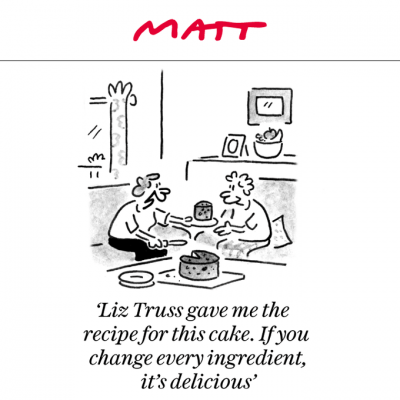 One small consolation for the present political turmoil in Britain is the brilliance of the Telegraph’s cartoonist, Matt, who produces a small cartoon every day, without fail.