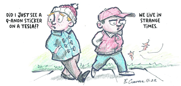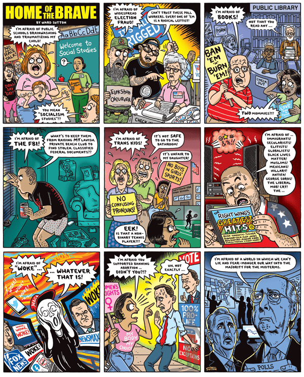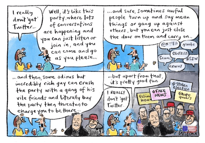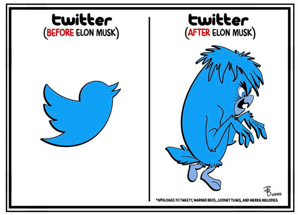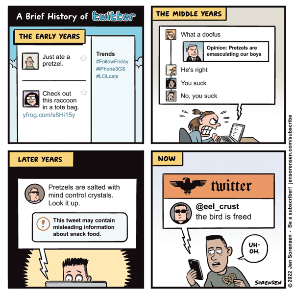 Jen Sorensen brings us up to date on the Rise and Fall of Twitter, tracing it from a fun hangout to a forum for sometimes acrimonious debate to a flood of disinformation to an ego trip that rivals that of the Orange God King, which is likely why Trump has, so far, declined reinstatement.