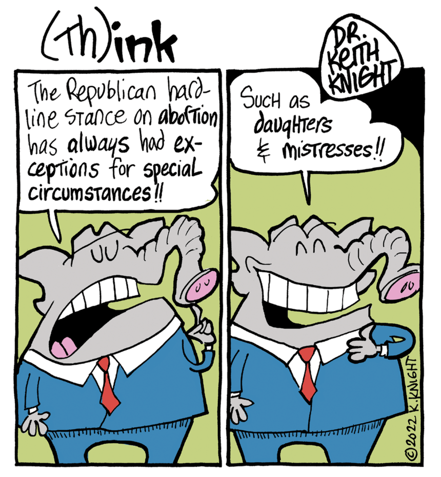 Keith Knight plows through the steaming pile of hypocrisy to remind us that, even before Roe v Wade, rank had its privileges and those with money and connections could always find a friendly physician to conduct a purported-and-perfectly-legal D&C on their daughters and mistresses, though clumsy local laws may now be making that loophole problematic.
