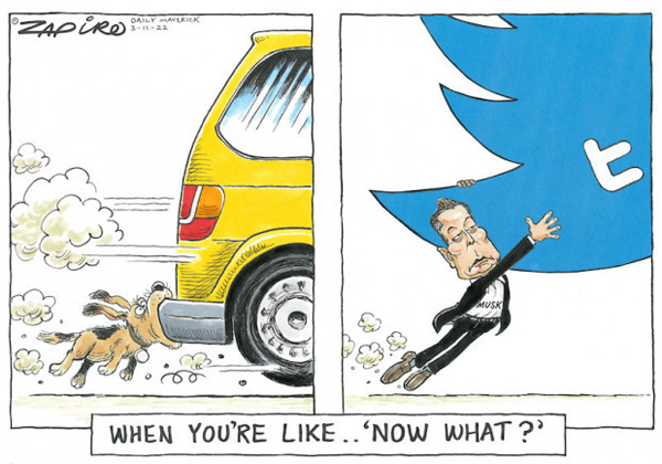 While Zapiro framed Musk in an old, familiar pose as the dog who caught a car and had no idea what to do next, the best part of this being the utterly perplexed, somewhat frightened dog, compared to the “I meant to do that” calm of the equally helpless Musk.