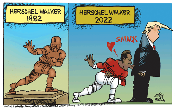 Mike Peters (KFS)’s cartoon has convinced me that, like the chaplain in Catch-22, I’m either in the midst of a hallucination or on the verge of sainthood, because I appear to be the only one with a vision of Herschel Walker and Donald Trump that dates from well before the present.