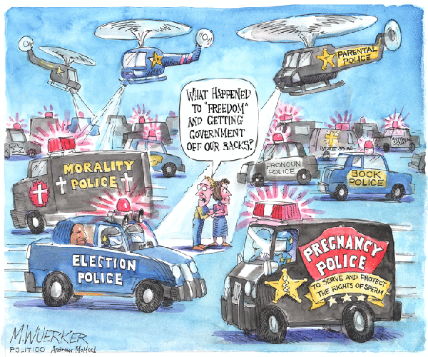 As Wuerker points out, it’s in complete denial of the call for “freedom” and to “get big government off our backs.” The latest scene in this farce has been threats to investigate private industry if they fail to donate to GOP campaigns which seems ideologically consistent with Ron DeSantis’s proposal for the Florida government to punish Disney for failure to salute.