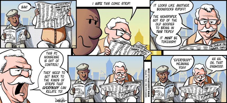 They didn’t, for example, understand why a strip like Retail would appeal to potential readers under 30, and they continue to persist in thinking that any cartoon with black characters is the same as any other cartoon with black characters, a form of blind tokenism highlighted in a February 2008 protest, of which these are a sample: