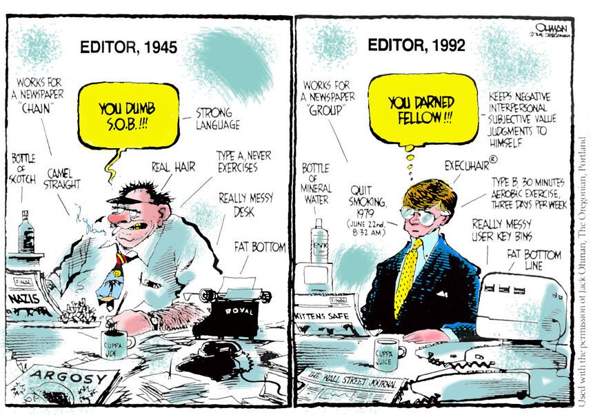 But, as this classic Jack Ohman cartoon illustrated 30 years ago, the installation of button-down corporate-approved editors left newspapers in the hands of people whose interest was in pleasing a distant HQ, not their local readers, and who were far more skilled at spotting split infinitives than at picking up on metaphors, sarcasm and creative hilarity.
