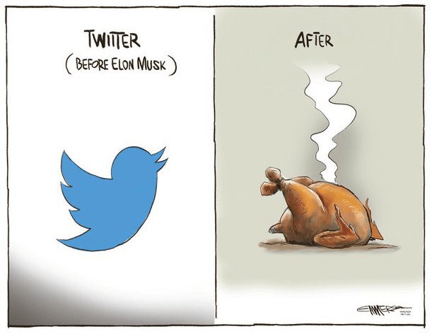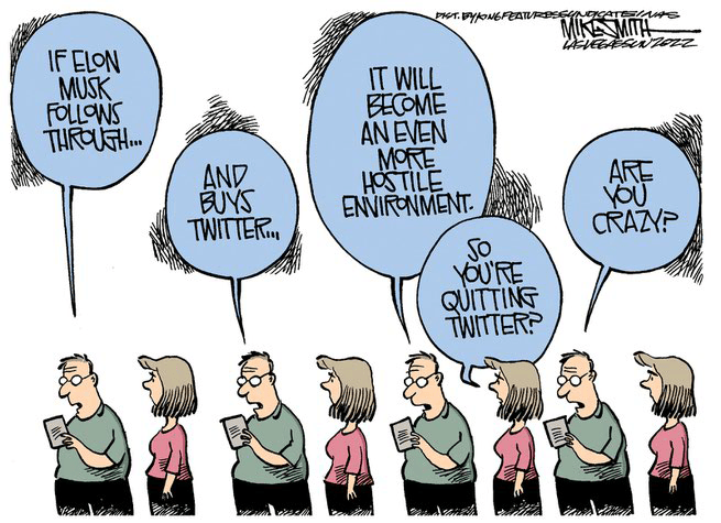Which brings us to the looming death of Twitter, the impending demise of print newspapers, and the need for cartoonists to straddle that fence between being essentially private people and still wanting to make a living doing what they love.