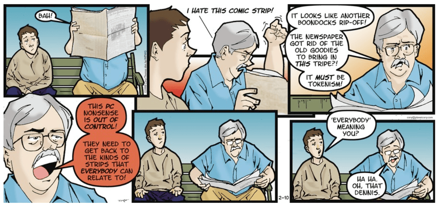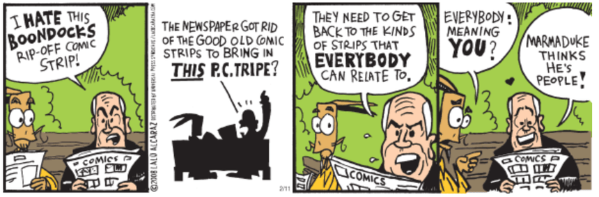 I was, for a time, the target of syndicate sales, and when they had a new strip to market, I wasn’t approached with “Here’s the audience it will appeal to” but, rather, “It’s by a prize-winning cartoonist,” which is an appeal to more of the same, which is the correct approach in a corporate-driven world in which readers are the product, not the clientele.