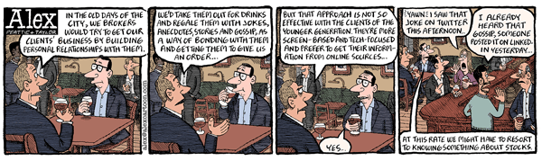 Alex confesses the perils of Old Fartitude, and it particularly cracked me up because, politics and stock trading aside, I’ve been appalled by the number of cartoonists — strippers and editorialists — who steal gags from the Internet and repackage them in hopes we won’t have seen the originals.