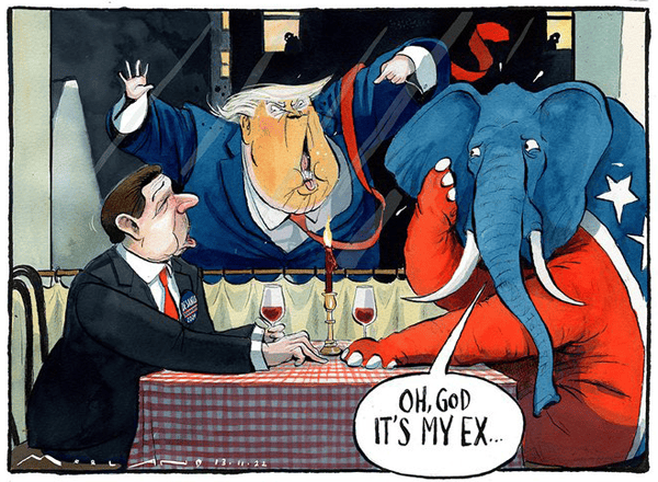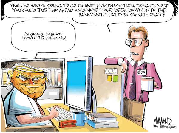 Speaking of which, Morten Morland targeted the Designated Loser and actually made me laugh out loud. As noted before, it’s not necessary for political cartoons to be funny, but blending humor and insight is a triumph, and the joke here is in playing upon how completely the GOP has rejected their erstwhile hero.