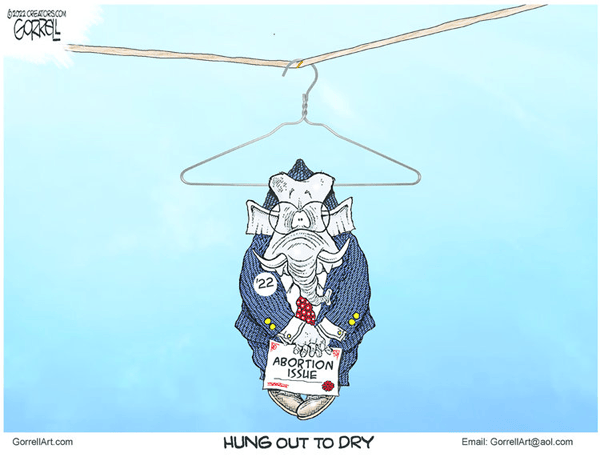 I’ll give Bob Gorrell (Creators) credit for conceding the loss and naming a major reason for the GOP’s surprising defeat, and extra credit for good use of an intact coat hanger in a cartoon, since keeping coat hangers from being un-twisted is the point of rejecting forced-birth mandates.