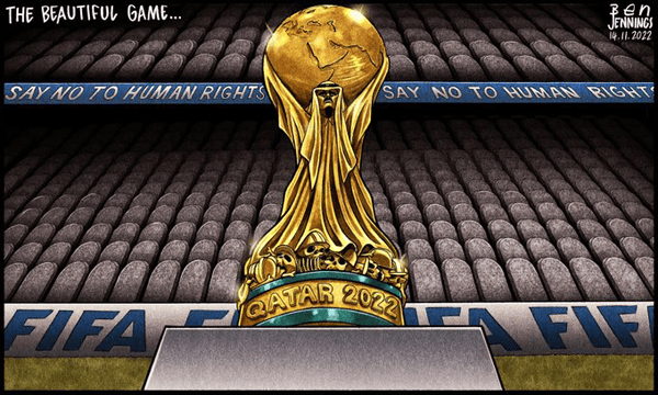 The Beautiful Game will begin the World Cup Tournament next Sunday, but the normal joy and excitement of the event is, as both British cartoonist Jennings and Dutch cartoonist Schot suggest, gravely over ridden by the fact of FIFA’s having awarded the games to Qatar, whose building of venues resulted in thousands of deaths, almost entirely of foreign workers in conditions of near serfdom.