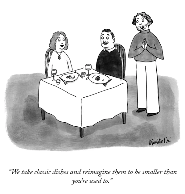 I feel Maddie Dai’s cartoon in the New Yorker is payback for their previous editors’ failure to use the submission, to which I will add that it’s good to see that city folks also have observed the way snazzy restaurants appear to take pride in serving soupçons as if it made the food more special.