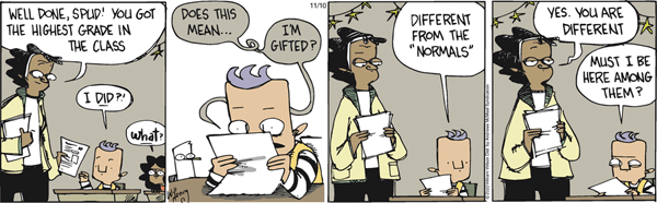 Can’t end the day on such a somber note, so here’s Wallace the Brave (AMS), fulfilling my remark the other day that Spud may be unusual but he’s only a “fool” in the classic, not the intellectual, sense. Best laugh here is in the first panel, when Rose is thunderstruck, the poor, over-achieving “normal.”